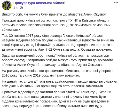 "В состав группы в целом входило семь человек, часть из них по подозрению в двух убийствах задержали в сентябре 2019 года. А сегодня оперативники задержали организатора убийства Амины Окуевой и покушения на убийство ее мужа Адама. Задержанный мужчина тоже является членом указанной преступной группы", - рассказал глава Нацполиции.