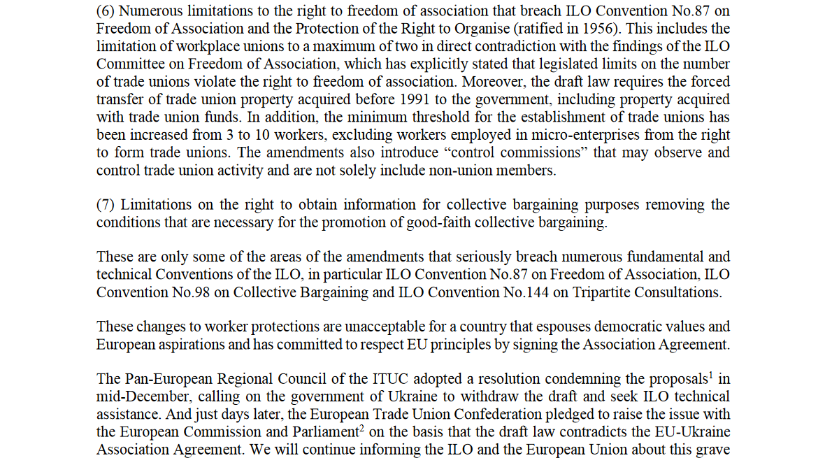 "В последнее время таким же образом были внесены и другие законопроекты, а именно проекты законов "О внесении изменений в некоторые законодательные акты Украины (относительно отдельных вопросов деятельности профессиональных союзов)" (рег. № 2681), "О внесении изменений в Кодекс законов о труде Украины о дополнительных основаниях для увольнения"(рег. № 2584) и другие. Они нарушают основополагающие права раьботников в обход международных стандартов. Эти законодательные изменения разрабатывались за закрытыми дверями без полноценных и откровенных трехсторонних консультаций с репрезентативными профсоюзами", - говорится в письме.