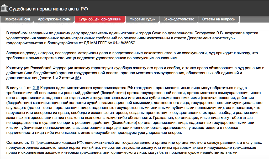 Что касается аргументов сочинской власти в суде - "административным ответчиком не представлено доказательств, опровергающих доводы административного истца (то есть Садыковой) или свидетельствующих о законности оспариваемого решения". Как результат - иск гражданки был удовлетворен. Подробно с решением суда можно ознакомиться ниже.