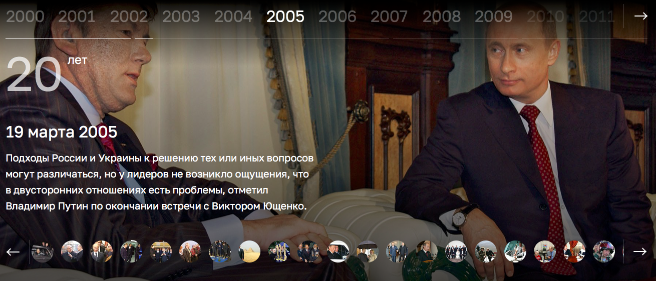 Первая порция кадров - с 2000 по 2005 год - появилась накануне Нового года. В этот период времени у президента России было много встреч с тогдашним украинским лидером Леонидом Кучмой. Вместе они несколько раз посещали Крым, гуляли там и пили вино, праздновали общие дни рождения, посещали рыбалку.