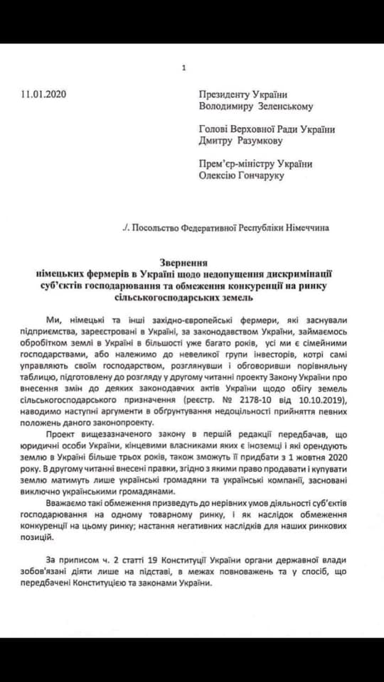 Письмо опубликовано на странице министра экономики Тимофея Милованова в Facebook. Авторы обращения отметили, что норма, которая предложена в законопроекте о рынке земли, и которая запрещает иностранцам или иностранным компаниям покупать землю сельхозназначения, противоречит Конституции Украины.