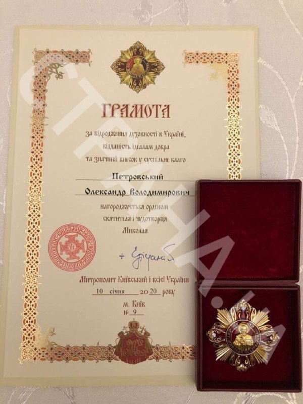 Днепровский бизнесмен и авторитет Александр Петровский (известный по прозвищу "Нарик"), который стоял во время церемонии по подписанию Томоса об автокефалии рядом с президентом Петром Порошенко, получил грамоту от предстоятеля ПЦУ митрополита Епифания. Об этом "Стране" стало известно со своих источников.