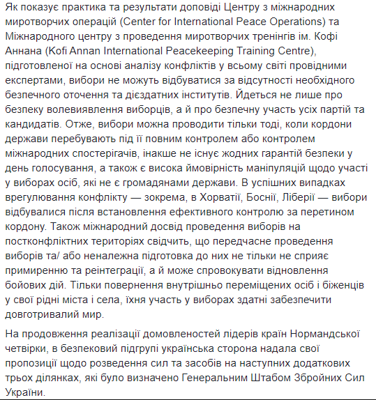 "Международный опыт проведения выборов на постконфликтных территориях свидетельствует, что преждевременное проведение выборов или ненадлежащая подготовка к ним не только не способствует примирению и реинтеграции, но и может спровоцировать возобновление боевых действий. Только возвращение внутренне перемещенных лиц и беженцев в свои родные города и села, их участие в выборах способны обеспечить длительный мир", - написала Олифер.