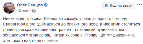 Сенцов 21 января уже находится в Давосе. Об этом он сообщил в Facebook и поделился фотографиями из зимней Швейцарии.