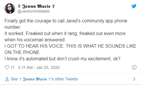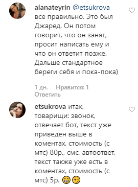 Другие поклонницы подтверждают, что голос Джареда говорит с пользователем несколько секунд, после чего сообщает о занятости и просит ему написать. "Он потом говорит, что он занят, просит написать ему и что он ответит позже. Дальше стандартное - береги себя и пока-пока", - пишет alanateyrin.