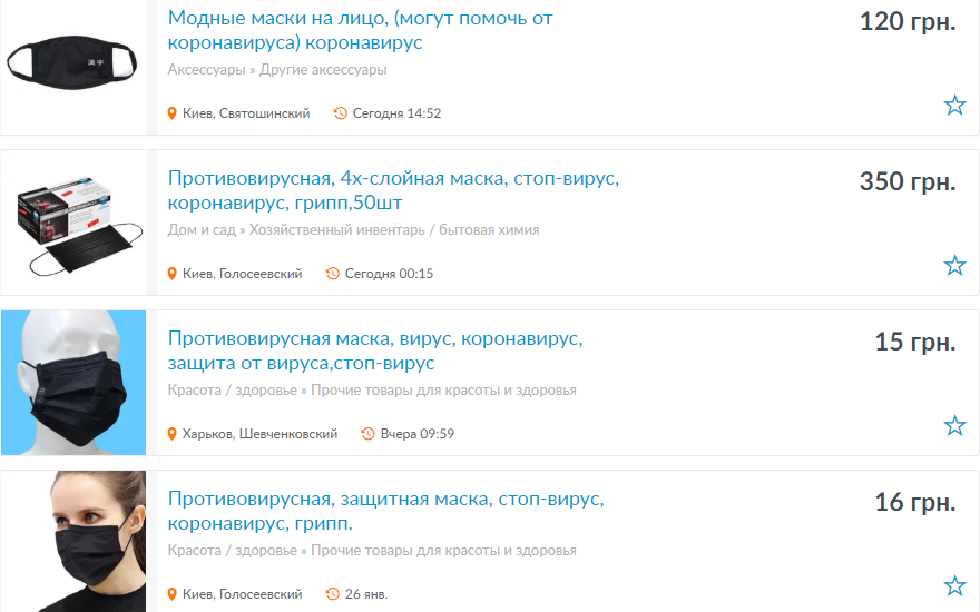 Также на сайте периодически появляются и удаляются объявления о масках, которые якобы могут защитить от "коронавируса". Модные изделия готовы продать от 15 до 350 гривен. По всей видимости, аферисты еще не придумали товар, на который "клюнут" доверчивые украинцы.