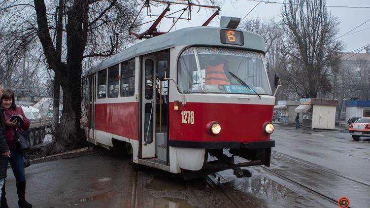 В Днепре трамвай сошел с рельсов и едва не вылетел на дорогу. Масшабное ДТП предотвратило оказавшееся на пути вагона дерево. Инцидент произошел утром в среду, 29 января, на левом берегу города при въезде на Амурский мост и попал на видео.