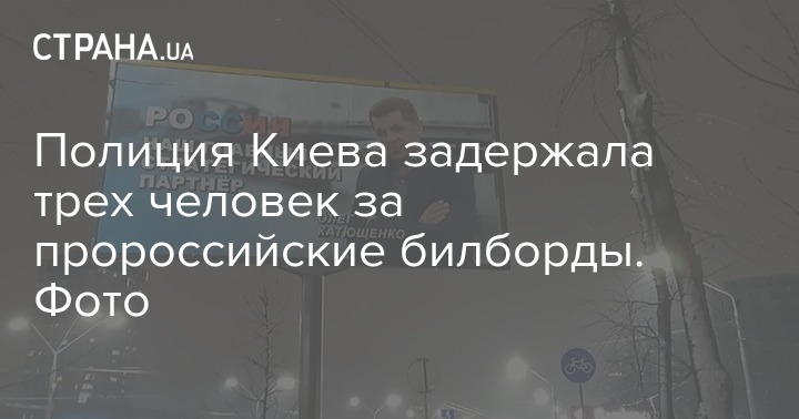 Киевские стражи порядка задержали троих человек за расклеивание билбордов с надписью "Россия - наш главный стратегический партнер" с подписью предпринимателя Олега Катющенко, который работает на строительном рынке столицы.