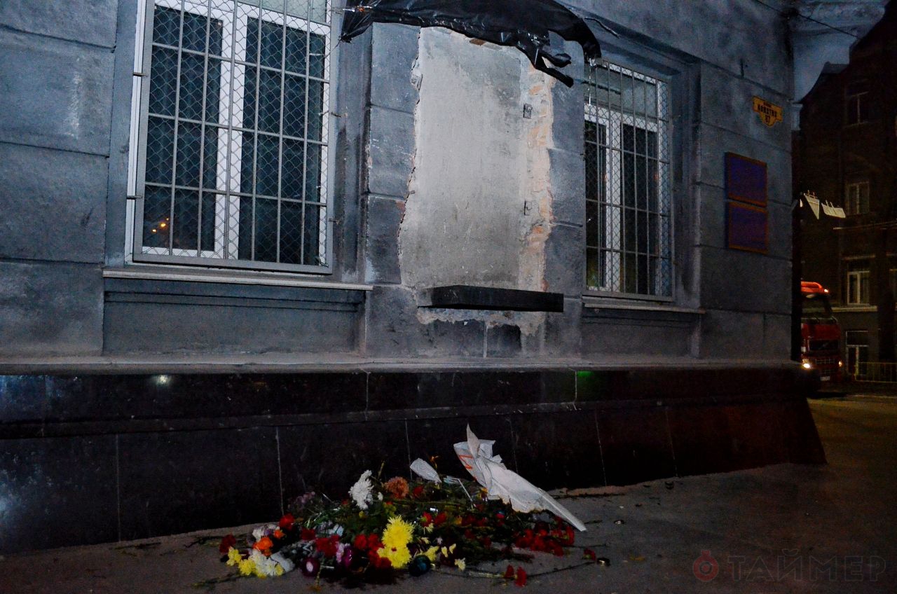 До демонтажа этот барельеф уже оскверняли. В прошлом году его залили краской и оставили надпись "Кат". В соцсети, пожелавшие остаться неизвестными исполнители сообщили, что приурочили такую акцию ко Дню украинского языка и письменности.