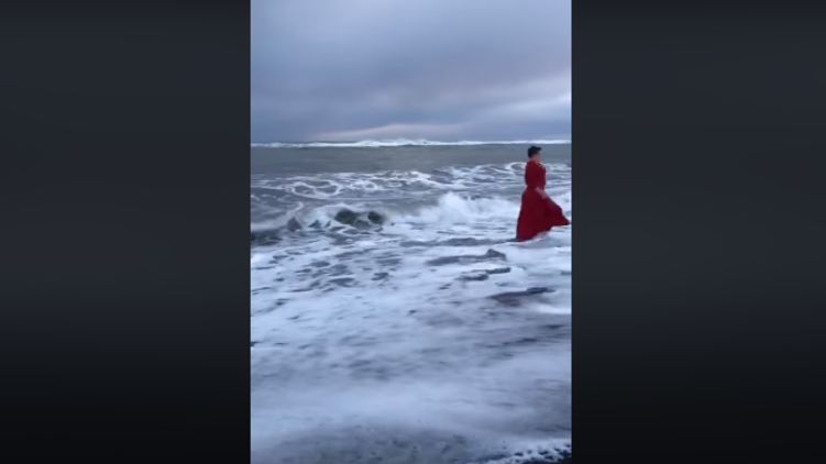 На видео запечатлено, как Надежда Савченко в ярком длинном красном платье заходит в воду, недолго купается и выбирается на сушу.