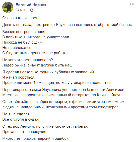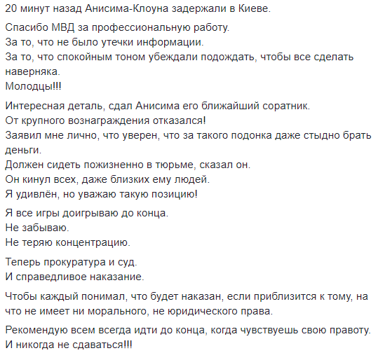 "20 минут назад Анисима-Клоуна задержали в Киеве. Интересная деталь, сдал Анисима его ближайший соратник. От крупного вознаграждения отказался! Заявил мне лично, что уверен, что за такого подонка даже стыдно брать деньги", - написал Черняк в Facebook.