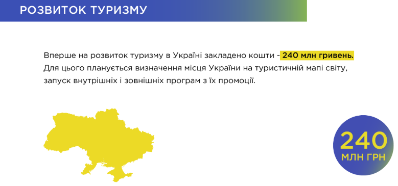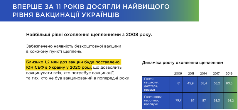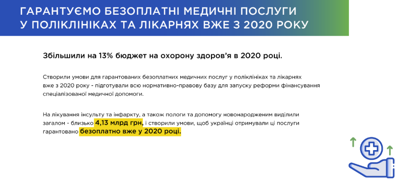 В число достижений попали сокращение очередей при устройстве в детские сады; перемены в школьном образовании; поддержка ученых; гарантирование бесплатных медицинских услуг уже с 2020 года; повышение уровня вакцинации украинцев; монетизация льгот ЖКХ; запуск государственной социальной службы; развитие кино; развитие туризма и т.д.