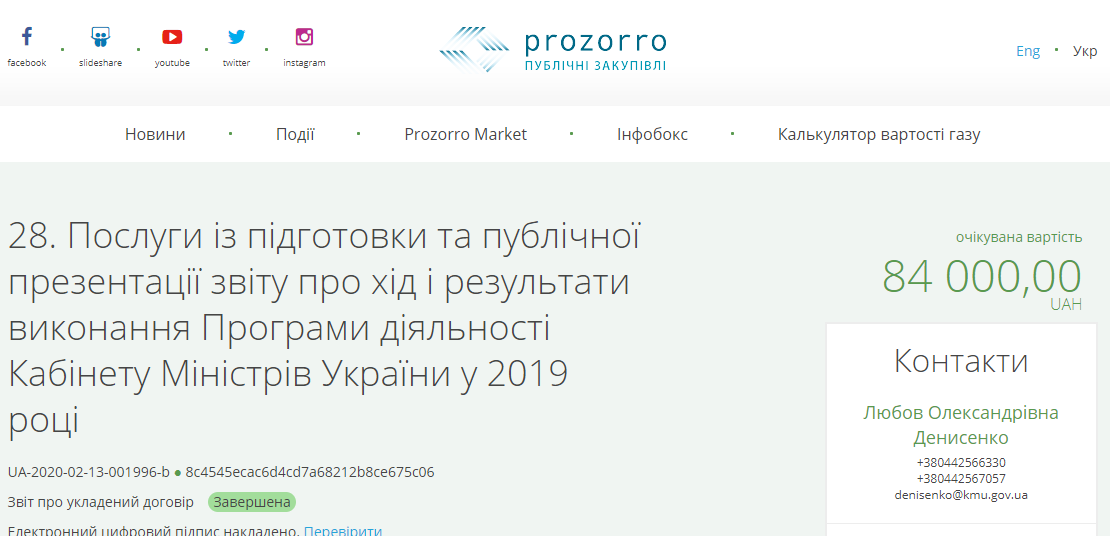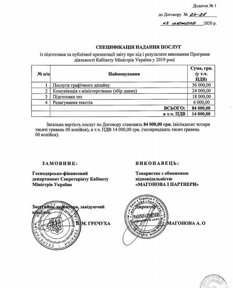 Позже выяснилось, что Кабмин через cайт Prozorro объявил тендер на услуги по подготовке и публичной презентации отчета о результатах деятельности Кабмина в 2019 году. Тендер на сумму 84 тыс грн получило ООО "Магонова и партнеры".