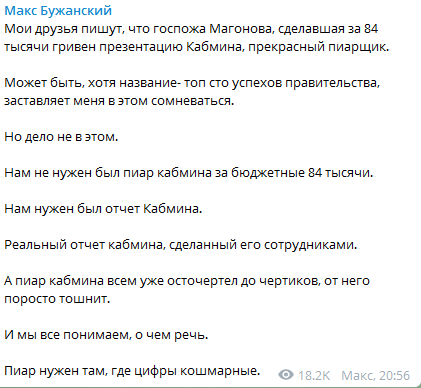 "Нам не нужен был пиар кабмина за бюджетные 84 тысячи. Нам нужен был отчет Кабмина. Реальный отчет кабмина, сделанный его сотрудниками. А пиар кабмина всем уже осточертел до чертиков, от него поросто тошнит. И мы все понимаем, о чем речь. Пиар нужен там, где цифры кошмарные" - добавил Бужанский.