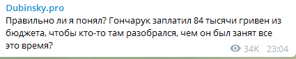 "Правильно ли я понял? Гончарук заплатил 84 тысячи гривен из бюджета, чтобы кто-то там разобрался, чем он был занят все это время?" - написал нардеп Александр Дубинский.