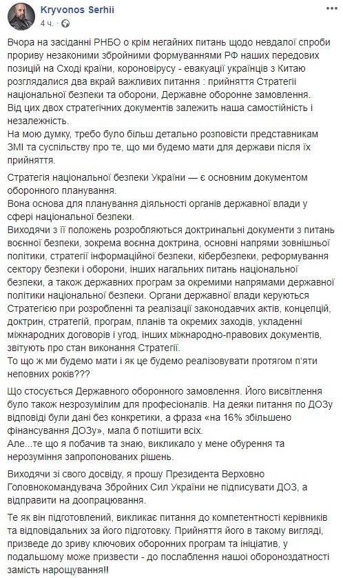 Заместитель секретаря СНБО Сергей Кривонос обратился с просьбой к президенту Владимиру Зеленскому не подписывать увеличенный в финансировании на 16% государственный оборонный заказ и отправить его на доработку.