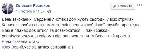 "Когда-то я сделал пост после увольнения с госслужбы про то, что держу в планах доучиться и довлюбиться. Планы всегда реализуются, когда осознанно отправляешь запрос во Вселенную. Она сказала "Да"! Юля Зорий, пора признаться миру!", - написал он на своей странице.