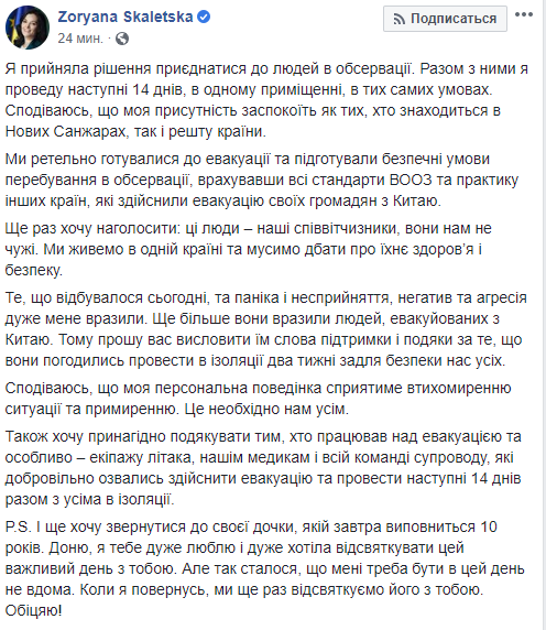 Министр здравоохранения Зоряна Скалецкая проведет две недели в одном помещении с привезенными в санаторий Нацгвардии в Новых Санжарах эвакуированными из Ухани. Об этом она написала на своей странице в Facеbook.