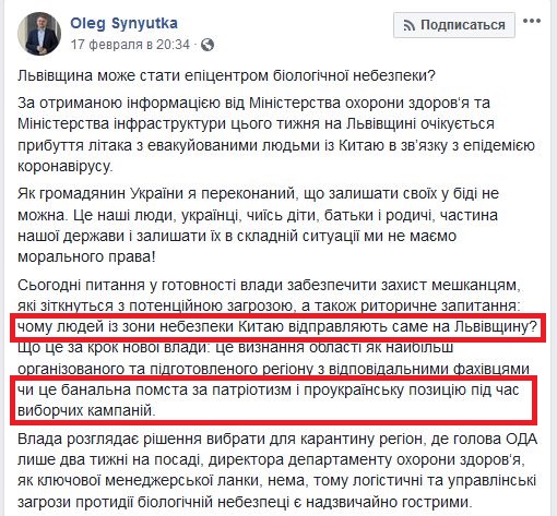 Одним из первых выступил экс-губернатор Львовщины Олег Синютка, который заявил, что людей из Уханя везут в Галичину чуть ли не для мести за то, что голосовал этот регион за Порошенко.