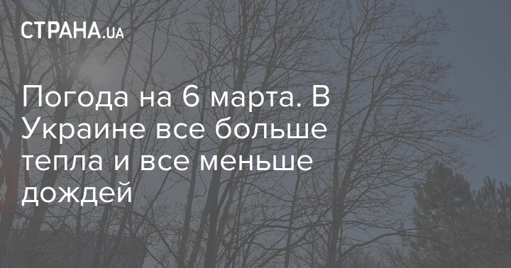 В пятницу, 6 марта, в Украине ожидается солнечная погода без осадков. Лишь ночью в большинстве северных, Винницкой и Черкасской областях местами пройдет небольшой дождь.