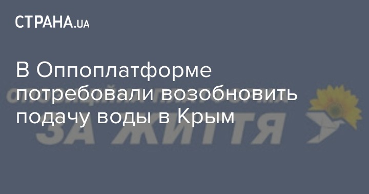 Партия "Оппозиционная платформа - За жизнь" призвала новое украинское правительство вернуть подачу пресной воды в Крым. В партии мотивируют это необходимостью сохранять права человека и не ухудшать экологическую ситуацию и отношение крымчан к власти Украины.