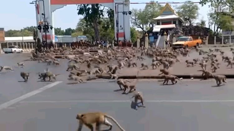 Сокращение числа туристов на фоне вспышки Covid-19 привело к тому, что приматы постоянно голодают. Жители Лопбури сняли момент, как большая толпа обезьян устроила свалку из-за кастрюли с йогуртом прямо на проезжей части.