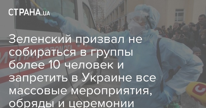 Владимир Зеленский предложил запретить в Украине массовые мероприятия с участием более 10 человек, включая обряды и церемонии. Об этом он заявил в своем обращении относительно предлагаемых им мер противодействия коронавирусу. Об этом сообщается на сайте главы государства
