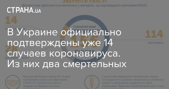 Таким образом, по состоянию на 20.00 17 марта в Украине лабораторно подтверждены 14 случаев заражения COVID-19, из них 2 летальных. Об этом говорится в сообщении Центра общественного здоровья на Facebook.