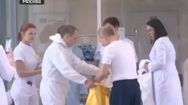 Появилось видео как президент России Владимир Путин, который прибыл в московскую больницу в поселке Коммунарка, где находятся на лечении заболевшие коронавирусом, переодевается в защитный желтый костюм и надевает респиратор.