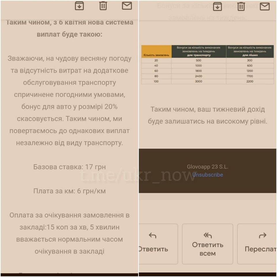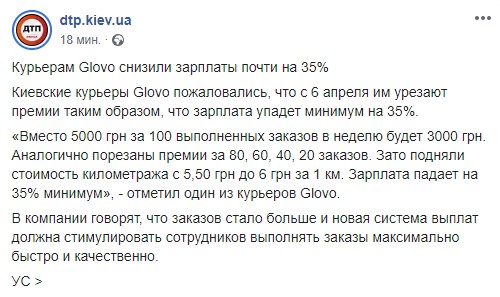 "Вместо 5000 грн за 100 выполненных заказов в неделю будет 3000 грн (минус 40%). Аналогично порезаны премии за 80, 60, 40, 20 заказов. Зато подняли стоимость километража с 5,50 грн до 6 грн за 1 км. Зарплата падает на 35% минимум", - отметил один из курьеров Glovo.
