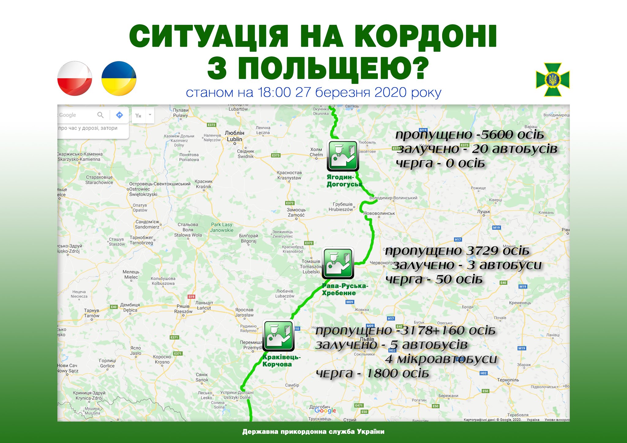 По состоянию на 18.00 27 марта в пункте пропуска Корчова-Краковец остается очередь из 1800 человек, там с ночи пропустили больше 3 тысяч человек, в пункте Гребенное- Рава-Русская пропустили около 4 тысяч и еще почти 6 тысяч - на КПП Дорогуск - Ягодин.