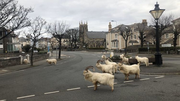 Больше сотни диких кашмирских коз повадились регулярно приходить в приморский городок Лландидно, что на севере графства Уэльс (Великобритания). Животные пользуются тем, что местные жители сидят на карантине из-за коронавируса, и поедают растительность на улицах.
