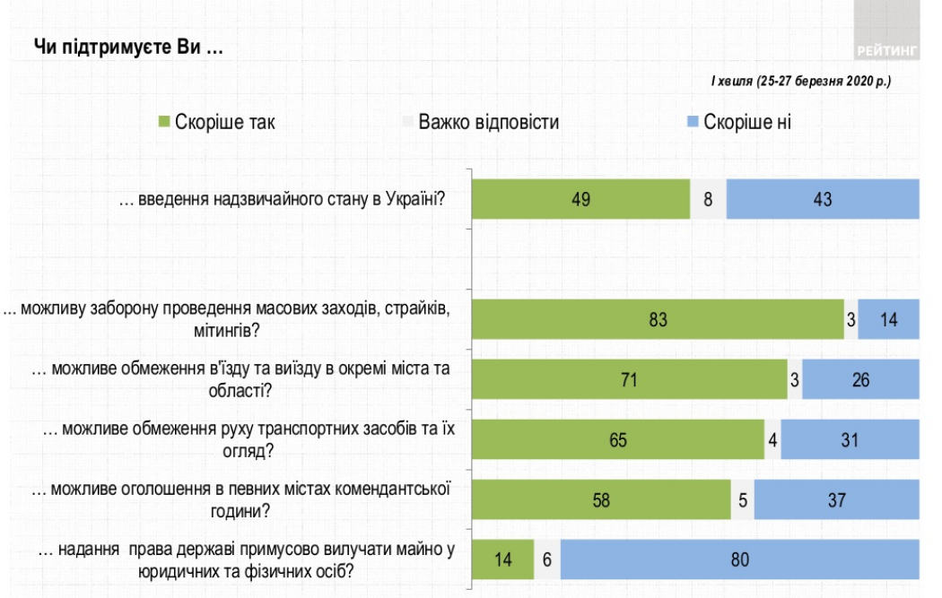 Несмотря на то, что подавляющее большинство украинцев считает угрозу коронавируса для страны реальной, введение чрезвычайного положения поддерживают только 49% жителей страны.