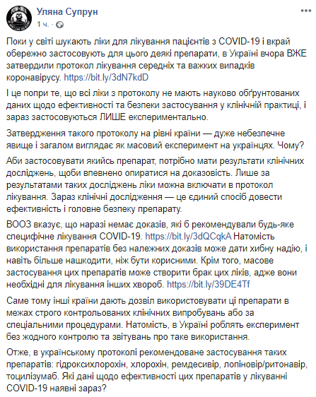 ВОЗ указывает, что пока нет доказательств, которые рекомендовали бы любое специфическое лечение Covid-19, отмечает Супрун. Она замечает, что использование препаратов без должных доказательств может дать ложную надежду и даже больше навредить, чем быть полезными. Кроме того, массовое применение этих препаратов может создать нехватку этих лекарств, ведь они необходимы для лечения других болезней.