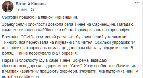 11:51 В Ровненской области сняли блокпосты вокруг села Тынное, которое ранее было закрыто на карантин из-за вспышки коронавируса. Об этом сообщил Глава ОГА Виталий Коваль