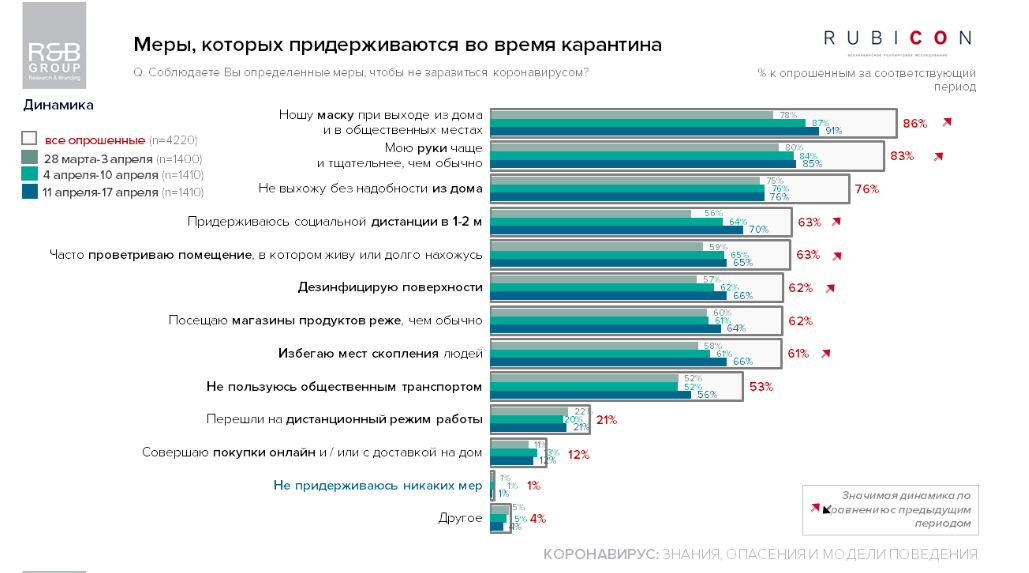 По сравнению с предыдущей волной (11-17 апреля 2020 года) было зафиксировано значительное снижение частоты упоминаний респондентами использования таких мер безопасности, как переход на удаленный режим работы (с 21% до 16%), отказ от использования общественного транспорта (с 56% до 49%), отказ покидать дом без надобности (с 76% до 71%), дезинфекция поверхностей (с 66% до 59%), частое проветривание помещений (с 65% до 56%) и снижение частоты посещения магазинов (с 64% до 56%).