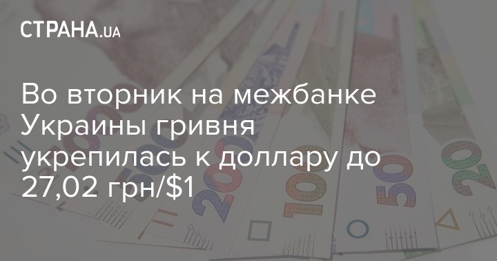 Согласно данным НБУ, справочный курс гривни на межбанке во вторник вырос до 27,05 грн/$1 с 27,13 грн/$1 в предыдущий рабочий день.