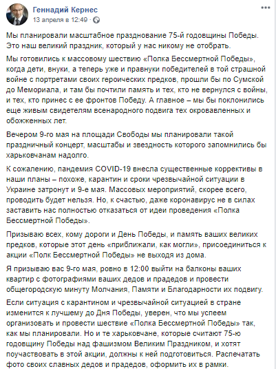 Практически такие же рекомендации жителям дал мэр Днепра Борис Филатов. Он сообщил, что в этом году День победы в городе отметят онлайн в связи с карантином. Об этом он написал в в Facebook.