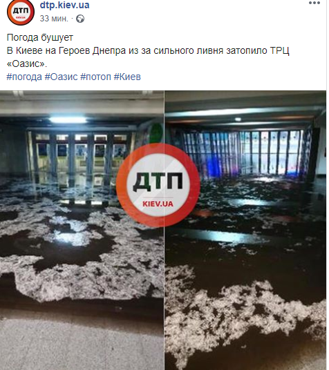 Дождевая вода затопила ТРЦ "Оазис" на проспекте Героев Днепра в Оболонском районе.
