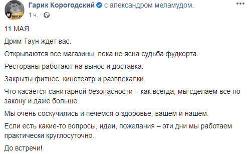 23:03 С 11 мая в ТРЦ Dream Town откроются все магазины, рестораны будут работать на вынос, кинотеатр и фитнес - закрыты. Об этом сообщил совладелец ТРЦ Гарик Корогодский