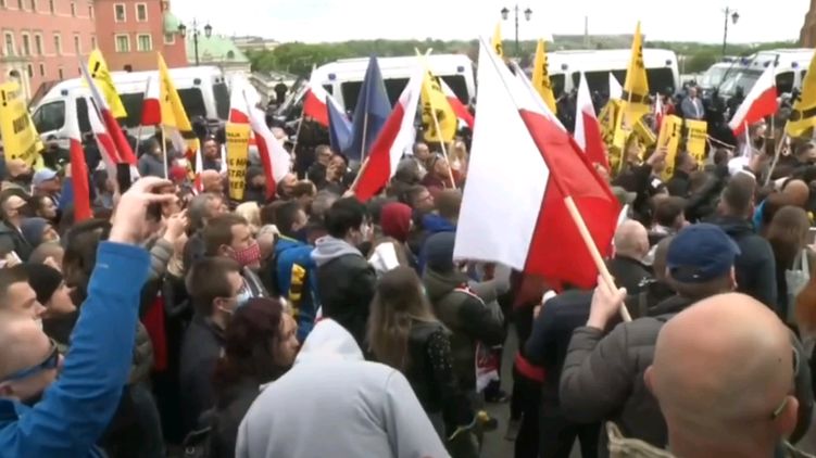 В интернете появилось видео жесткого антикарантинного митинга жителей Варшавы, которые собрались в субботу, 16 мая, на протест против экономических потерь, вызванных ограничениями и запретами из-за эпидемии коронавируса.