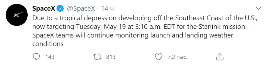 Запуск X-37B был перенесен с субботы (16 мая) из-за непогоды. Это повлияло на запуск очередной партии из 60 спутников SpaceX для сети интернет-покрытия Starlink. Компания уже перенесла запуск на 19 мая, говорится в ее Twitter.