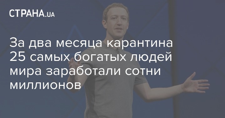 Больше других разбогател на пике пандемии основатель соцсети Facebook Марк Цукерберг. За последние два месяца акции Fаcebook поднялись в цене примерно на 60%. Его активы подорожали на 31 миллиард долларов. Сейчас его состояние оценивается в 86,5 млрд долларов. Цукерберг переместился с седьмого места в списке богатейших людей планеты, которое он занимал в апреле, на четвертое.
