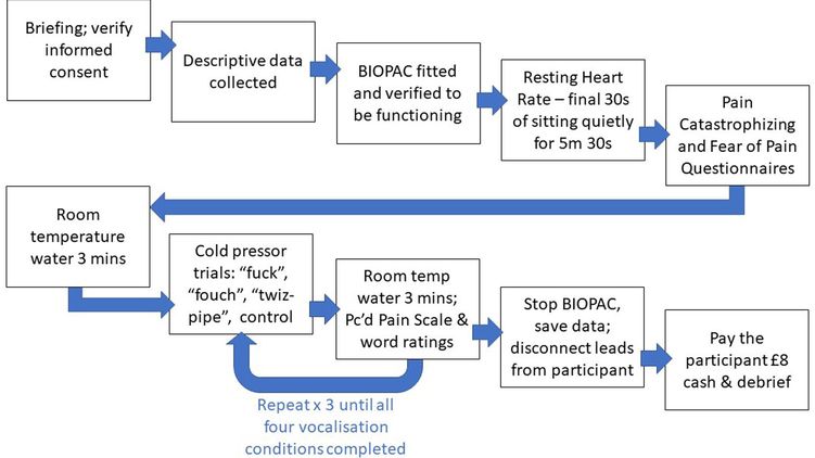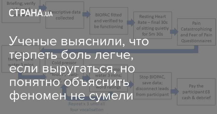 Поэтому исследователи Килского университета Ричард Стивенс и Олли Робертсон решили провести эксперимент с тремя словами: fouch, которое вызывает эмоциональную реакцию, ругательством fuck и выдуманным, но забавным словом twizpipe. Они попросили 92 добровольца опустить руку в контейнер с водой температуры от 3 до 5 градусов, оповестить о моменте, когда начиналась боль и продержать конечность максимально долго, пока боль не станет невыносимой. При этом испытуемым нужно было повторять одно из выбранных слов.