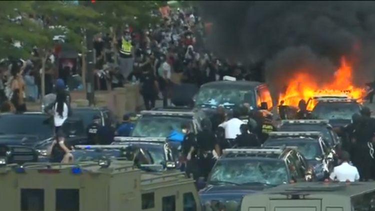 Толпа митингующих в Атланте устроила акты вандализма в связи с убийством афроамериканца Джорджа Флойда, разгромив несколько полицейских автомобилей и выбив окна в штаб-квартире CNN.