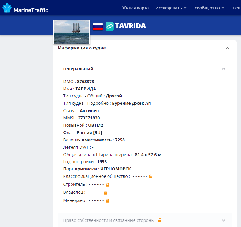 В международной базе судов украинскую буровую вышку "Таврида" пометили российским флагом