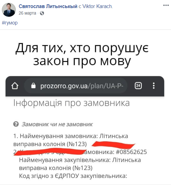Подает Литинский не только "мовные" иски. Недавно он написал заявление в полицию на "Слуг народа" за возложение цветов ко Дню Победы. Основание - они были без масок.