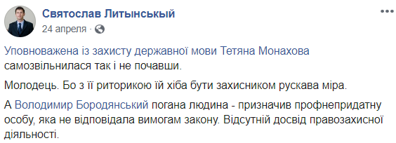 "Уполномоченная по защите государственного языка Татьяна Монахова самоуволилась, так и не начав.