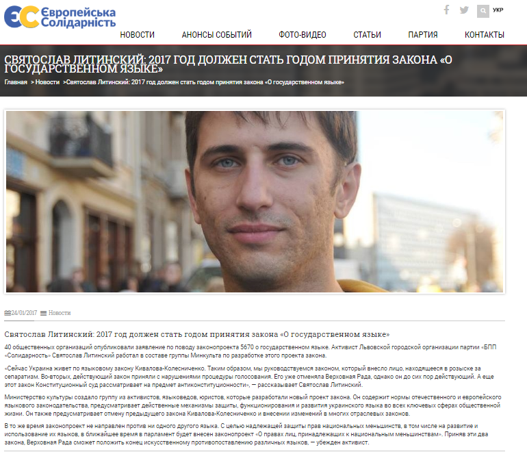Но вернемся к политическому прошлому Литинского. В 2017 году он был активистом Львовской городской организации партии "БПП Солидарность" - чему есть свидетельства на официальном сайте партии. Причем на русском языке.