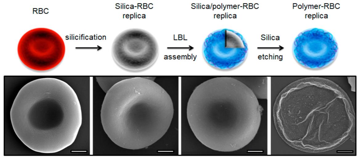 Искусственные частицы создавали в четыре этапа. Чтобы скопировать форму эритроцитов, живые клетки покрывали 10-нанометровым слоем аморфного оксида кремния, помещая фиксированные в формальдегиде красные кровяные тельца в раствор кремниевой кислоты на 24 часа, а затем осаждая кислоту с помощью ферментов. Полученные частицы использовали как форму для послойного осаждения самособирающихся биосовместимых полимеров. Затем из частиц вытравливали оксид кремния плавиковой кислотой, а полимерный остов толщиной около 90 нанометров покрывали мембраной, которую выделили из эритроцитов.